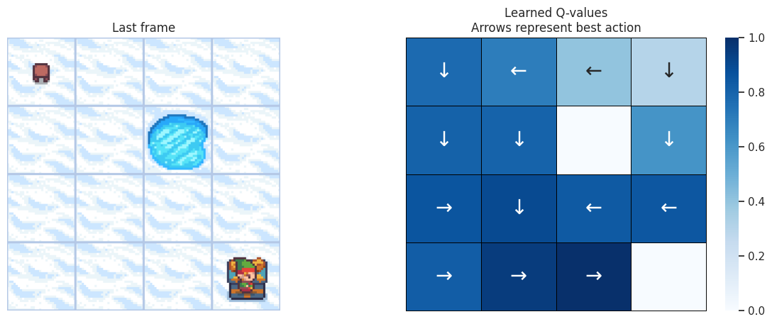 With the following function, we’ll plot on the left the last frame of the simulation. If the agent learned a good policy to solve the task, we expect to see it on the tile of the treasure in the last frame of the video. On the right we’ll plot the policy the agent has learned. Each arrow will represent the best action to choose for each tile/state.