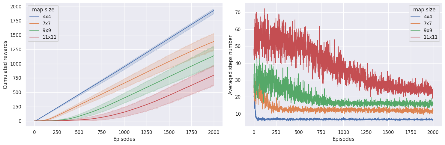On the \(4 \times 4\) map, learning converges pretty quickly, whereas on the \(7 \times 7\) map, the agent needs \(\sim 300\) episodes, on the \(9 \times 9\) map it needs \(\sim 800\) episodes, and the \(11 \times 11\) map, it needs \(\sim 1800\) episodes to converge. Interestingly, the agent seems to be getting more rewards on the \(9 \times 9\) map than on the \(7 \times 7\) map, which could mean it didn’t reach an optimal policy on the \(7 \times 7\) map.